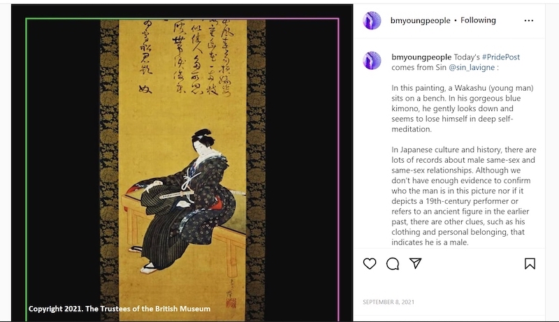 此外,博物館也邀請成員響應「同志驕傲月」,挑選一件呼應LGBTQ+主題的館藏來撰寫Instagram貼文。其中一篇貼文介紹葛飾北齋所繪製的若眾文案圖,透過觀察卷軸中少年(若眾)的穿著與配件,思考不同歷史文化脈絡反映出的性別角色及性別認同。