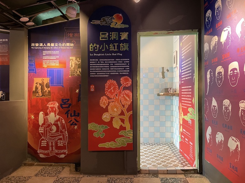 第一主題為「呂洞賓的小紅旗」,呂洞賓為理髮業的守護神,展覽從古老信仰開頭,爬梳理髮文化在臺灣歷史上重要的轉捩點,包含滿清剃髮留辮的高壓統治手段,以及日治時期臺灣人自願斷髮,多變的男士髮型就此展開,禿頭藥水、香皂等身體美容商品紛紛上市。光復初期,理髮風格分為臺灣派、上海派與福州派,男士理髮廳服務出現差異化。展間也介紹現今在中臺灣經營地有聲有色的6家男士理髮店。