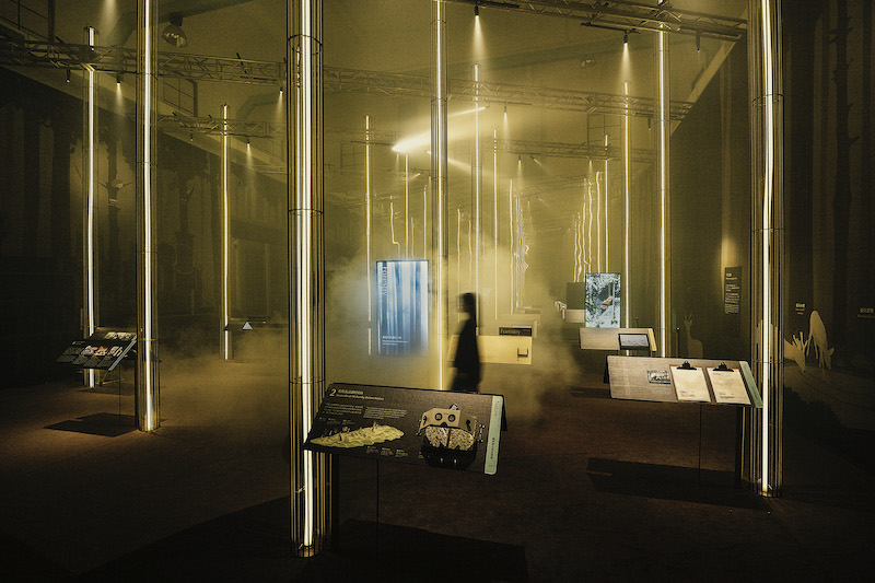步入「記憶 阿里山」展間,鼻尖瞬間盈溢特製複方精油的林木芬芳,舉目所及是流轉熒熒光輝的高大立柱,透過鏡面反射彷彿走入無盡深山,靄靄薄霧、林木伴身。耳中不時傳來「阿里山聲音地景」互動裝置的火車、鳥鵲、登山客和原住民聲響,交織出屬於阿里山的動人音韻。