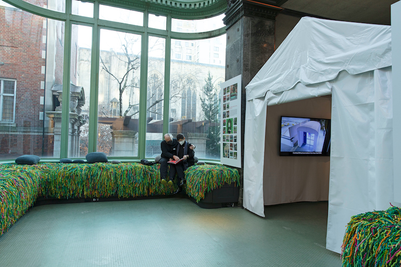 這項展覽由美國MASS設計集團和庫柏.休伊特設計博物館共同策劃,源自該館2020年啟動的「快速回應蒐藏」(Rapid Response Collecting)計畫,旨在記錄並蒐集疫情期間的第一手資料和物件。展覽以美國藝術家塞繆爾・斯圖布爾菲爾德(Samuel Stubblefield)的多媒體裝置揭開序幕。藝術家運用人工智能和腦波圖,視覺化參與者的神經活動,再匯集腦波數據,創造出一幅「集體肖像」,反映了使用數位科技監測身體健康是日益增長的趨勢。