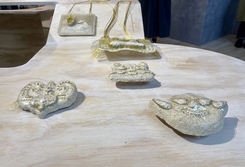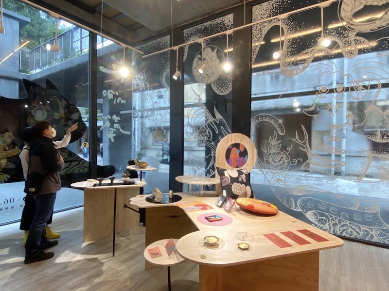 旅德藝術家林儀君則以「虎頭紋童帽」、「黃色蝙蝠形煙草袋」、「虎頭塑形短圈」、常玉的畫作等,將藏有貓系動物圖像的館藏做為創作元素,融合貓咪從野性到撒嬌的可愛特性,使用特殊材料「蛋殼」,搭配瓷粉、透明矽膠與日本金織線,創作出童趣十足的胸針、墜飾等系列飾品。