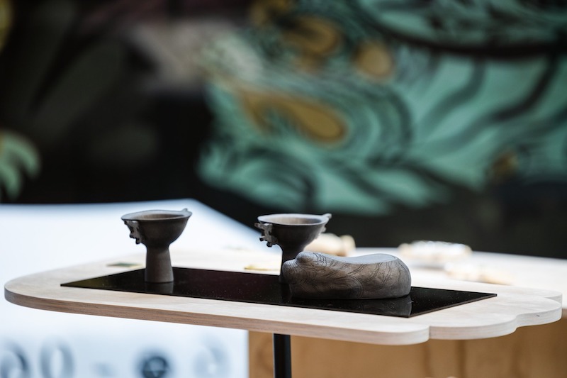10位新生代工藝創作者從史博館藏品中尋找靈感,解構多件館藏的形象、特徵與內涵,並大膽使用各種媒材,創作出一件件充滿巧思的生活物品。例如擅長陶瓷創作的林精哲,推出結合排灣族文化的「黫山水器」,將館藏「釉鐵繪褐彩花卉紋虎形枕」轉化為盛放水器的基座,館藏「虎形帶鉤」則設計成器皿兩側的裝飾。這套器皿是以純粹的火、土、木炭燻色,並以灰燼作為釉藥燒製而成,黝黑的色澤啟發自排灣族人家中長年煙燻的陶器,對族人來說,煙是與祖先溝通的媒介,也承載了日日年年的生活記憶。