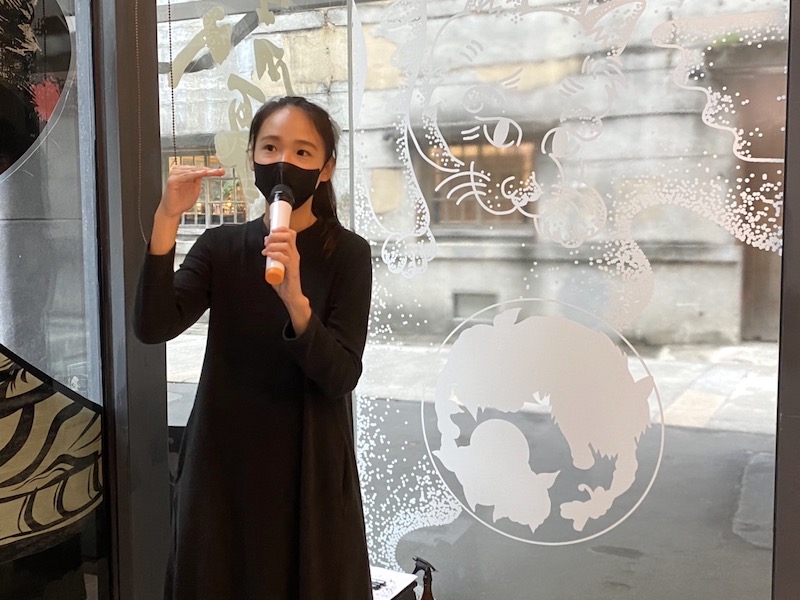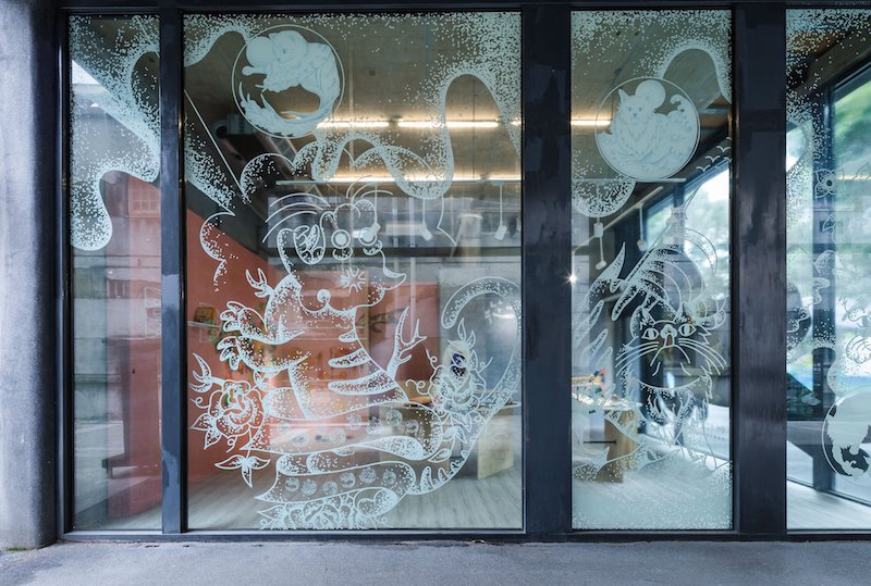 在玻璃牆上還有一大幅壁畫,三隻貓咪正在玩球,每顆球上都藏有貓咪。這是刺青師康予嫣仿刺青技法一點一點繪製而成,更特別留了一顆球現場創作。原來,球上的圖騰就是她以史博館典藏設計的紋身貼紙,牆上的壁畫則嘗試將畫布從皮膚移轉到玻璃上,讓觀眾從旁觀察並認識刺青創作的過程。