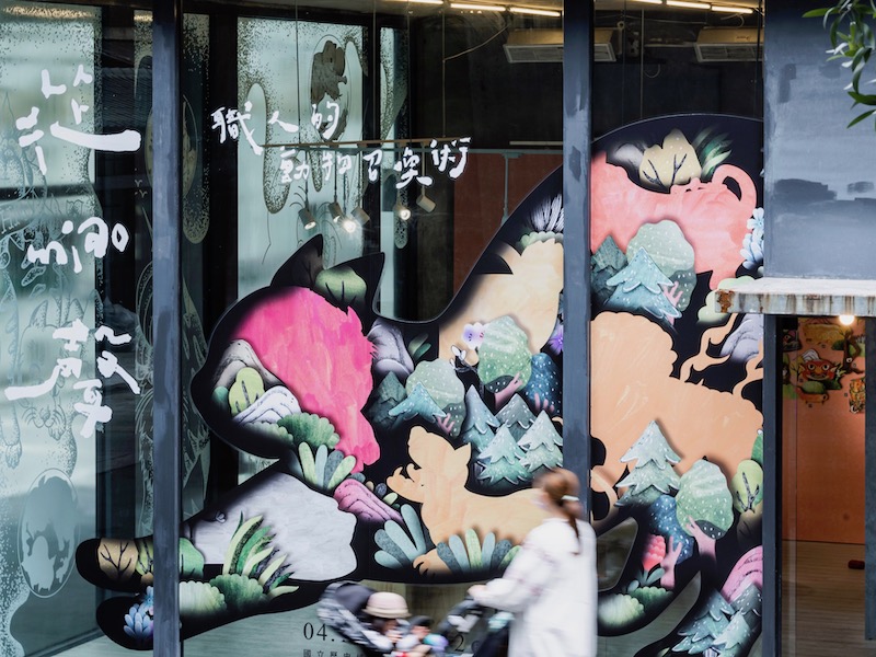 在玻璃牆上還有一大幅壁畫,三隻貓咪正在玩球,每顆球上都藏有貓咪。這是刺青師康予嫣仿刺青技法一點一點繪製而成,更特別留了一顆球現場創作。原來,球上的圖騰就是她以史博館典藏設計的紋身貼紙,牆上的壁畫則嘗試將畫布從皮膚移轉到玻璃上,讓觀眾從旁觀察並認識刺青創作的過程。
