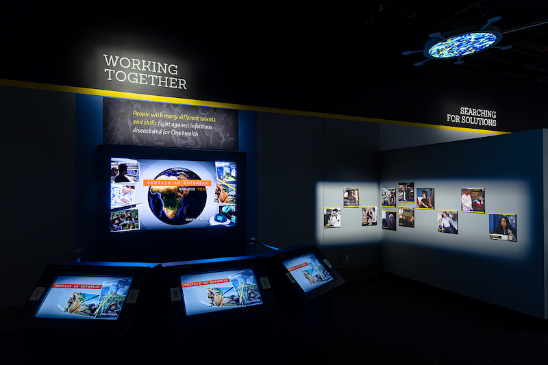 第三部分則聚焦在如何防範這些疾病,於「Working Together」展區中,人們可以生動地透過扮演不同角色,一同努力完成疾病防範。例如,觀眾可以化身醫生,協助病人測量額溫、聽病人的心音等;或以藝術家的角色,創作防疫相關的宣導插畫,引導民眾注重衛生。藉由刻劃不同人格特質者的努力,呈現如何在防範疫情下扮好自己的角色,並列出重要的歷史人物作為典範。