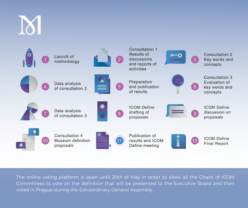 而後,MDPP改組為ICOM Define,並歷經18個月透明參與過程,包含四輪諮詢、邀請每個ICOM委員會提交一份關鍵詞或概念清單,ICOM Define再以量化分析最常出現的關鍵詞,作為新定義的基礎。收斂至五個版本的草案,再進行表決與修正,最終版本在布拉格大會以92%高票通過。