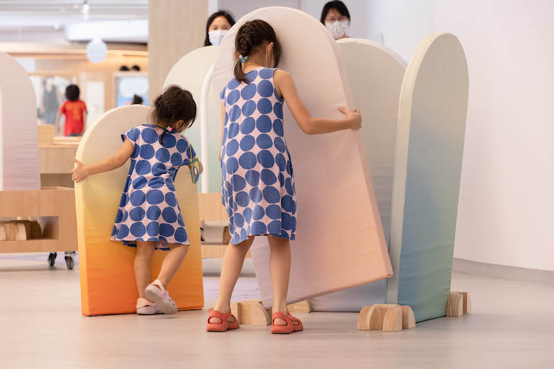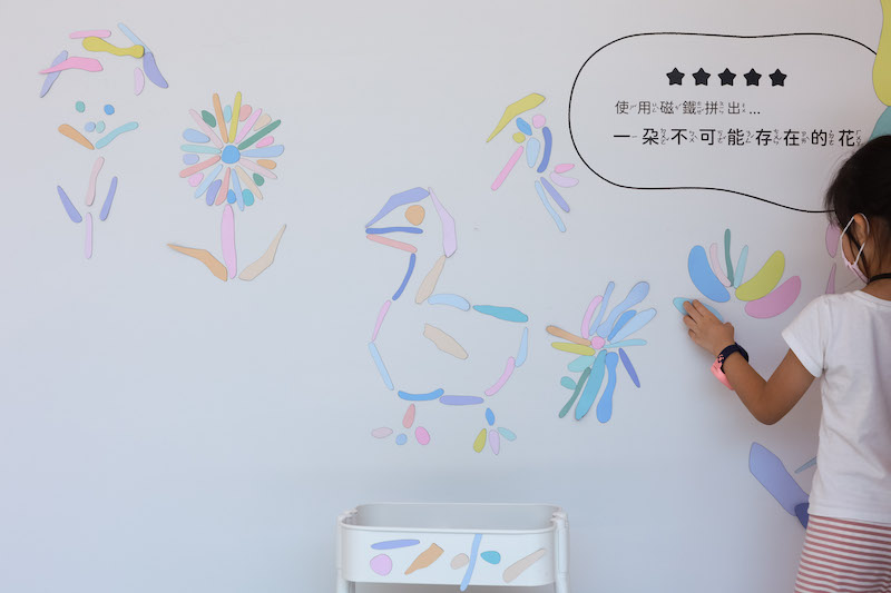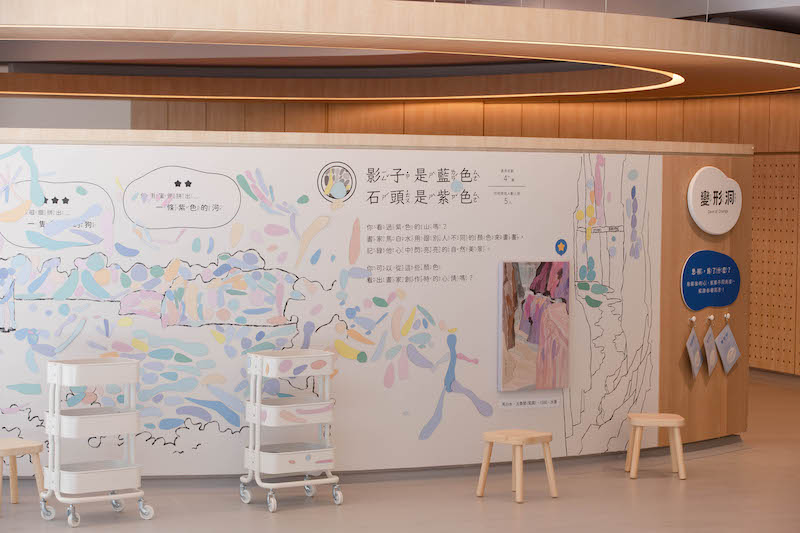 針對學齡前兒童,牆上設置不同觸感的素材,刺激對藝術的感知與想像。主要教具則選擇版畫,例如以廖修平系列版畫製成積木,針對其注重形狀、色彩、不受光線構圖影響,簡單又拙樸的藝術形式,成為引領學齡前兒童進入藝術的敲門磚。