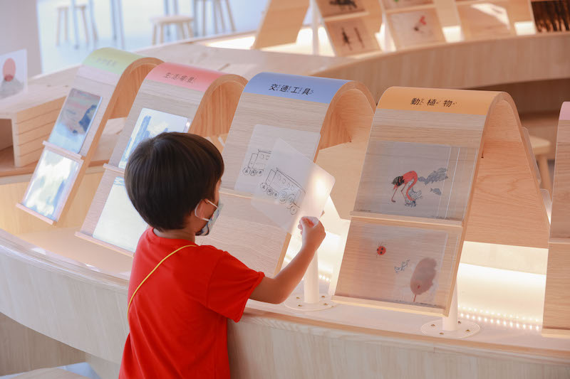 此外,館方也透過多次工作坊活動,了解兒童對展覽的理解程度,並徵詢他們的意見以改善教具使用方式。例如,發現兒童難以選擇想要的故事圖卡,而將圖卡分門歸類標示;也回饋希望圖卡多重前後鋪排的需求,將圖卡臺座調整為放置多張的設計,利於兒童安排角色多元場景、與同伴一起說故事。