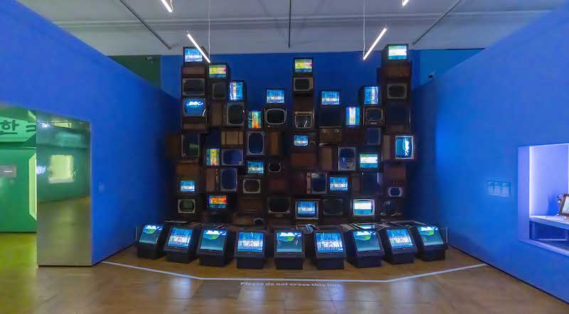 第一展區「從瓦礫到智能手機」(From Rubble to Smartphones)聚焦在韓國在二次大戰後的發展,重要歷史事件包括1988年首爾夏季奧運會首次在海外成功轉變形象,並在1990年代末期以具前瞻性的IT創新走出亞洲金融風暴,成為世界上最早開創電子產業的國家之一。除了攝影、文獻資料和電子產品的早期例子(如世界上第一台商業MP3播放器),「錄像藝術之父」白南準(Nam June Paik)於1986年創作的經典作品《海市蜃樓》(Mirage Stage)是此展區的最大亮點──這件裝置作品由33台電視機所組成,展現了藝術家頌揚崛起的電視文化,並傳達電視能幻化為烏托邦的潛在可能。