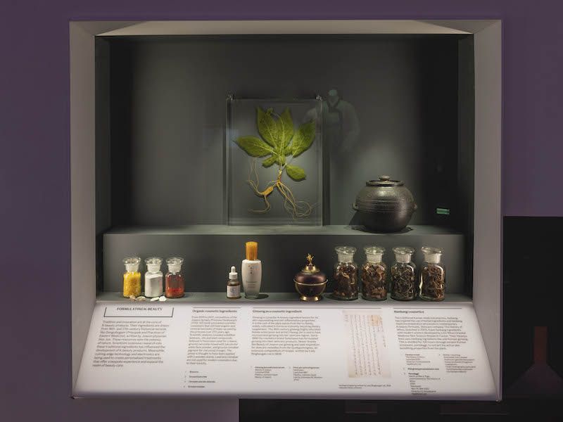 V&A做為典藏服裝設計的重要博物館,展覽特別著墨韓服(Hanbok)和韓流時尚的關聯性。傳統韓服由於樣式上的限制,大多僅出現在重要場合,但其具歷史意義的標誌性設計是許多當代設計師的靈感來源。展覽最終展區便透過古今對比,呈現傳統韓服對當代設計的影響。其中,金英珍(Kim Young Jin)的設計是結合古典與當代的經典例子,其品牌「差異金英珍」(Tchai Kim)以「生活韓服」為主要概念,提倡將傳統韓服現代化並融入生活,此區展出的紫色連身裙便可見化繁為簡的新時尚美學。此外,美妝產業亦是推動韓流的重要功臣,對韓流的全球化現象不容小覷。最終展區便展示了13世紀至今的化妝品包裝,呈現美妝品牌如何在繼承文化傳統下,同時注入融合東西方美感的設計。