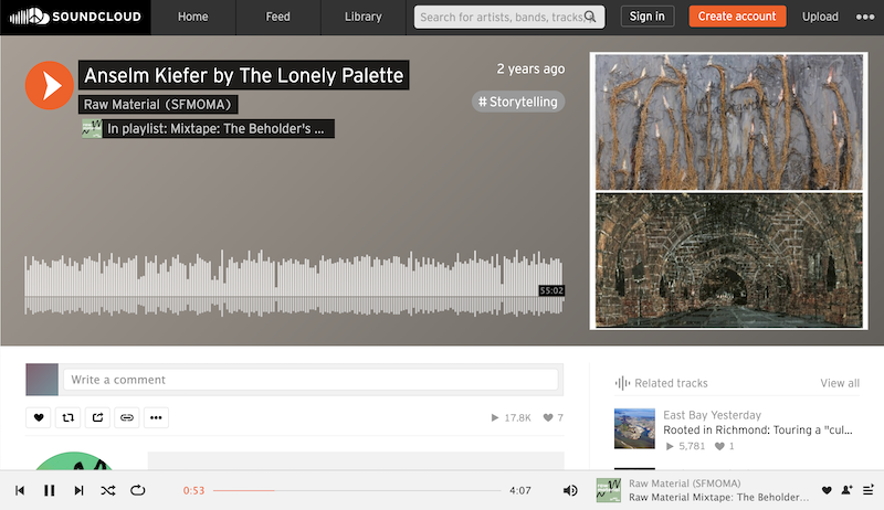 我們現在熟悉的「Podcast」也於2008年增設獎項[註1],美國一些著名的博物館都得過繆思獎的Podcast項目,而其中最大贏家,是舊金山現代藝術博物館(San Francisco Museum of Modern Art,簡稱SFMOMA)——於2017至2019、2021年屢屢獲獎,尤其2021年Podcast節目《觀察者的分享:藝術家基佛》(The Beholder’s Share——Anselm Kiefer)採用詩、文學與藝術的對話,贏得評審青睞,榮獲金獎。