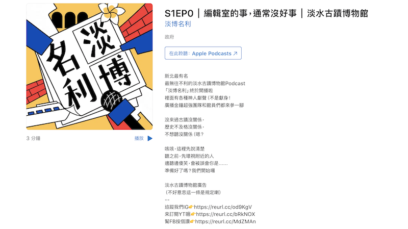我國博物館在2020年因疫情也開始製作Podcast節目,各博物館與美術館採用策略與關注焦點不同。如淡水古蹟博物館的《淡博名利》,請到廣播金鐘獎得主吳宇軒化身為節目記者「名利」,採用流行影視常用的「時間穿越」概念,讓「名利」回到160年前的淡水,進行實況報導,所用材料來自「淡水開港相關展示史料蒐集」調查報告。