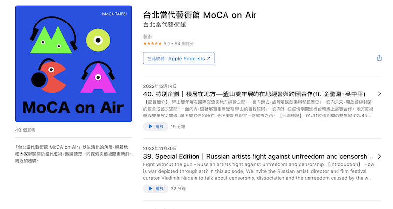 國立歷史博物館Podcast則從「看」《歷史文物》季刊,延伸到「聽」文物的傳播方式,希望打造聽的行動博物館;而國立故宮博物院《宮說宮有理》與台北當代藝術館《MoCA on Air》,都經過市場調查鎖定目標觀眾,再進行節目製作與主題。