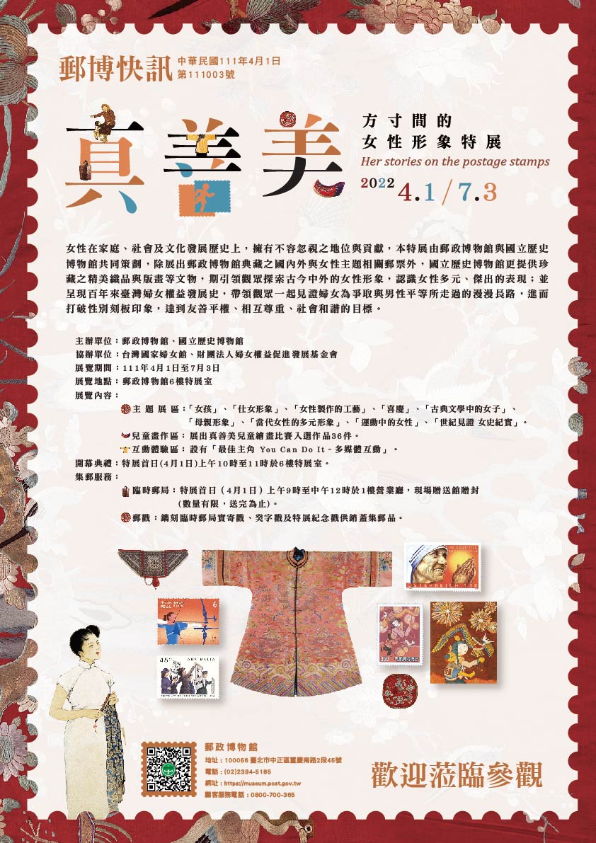 女性在家庭、社會及文化發展歷史上,擁有不容忽視之地位與貢獻,本特展由郵政博物館與國立歷史博物館共同策劃,除展出郵政博物館典藏之國內外與女性主題相關郵票外,國立歷史博物館更提供珍藏之精美織品與版畫等文物,期引領觀眾探索古今中外的女性形象,認識女性多元、傑出的表現;並呈現百年來臺灣婦女權益發展史,帶領觀眾一起見證婦女為爭取與男性平等所走過的漫漫長路,進而打破性別刻板印象,達到友善平權、相互尊重、社會和諧的目標。