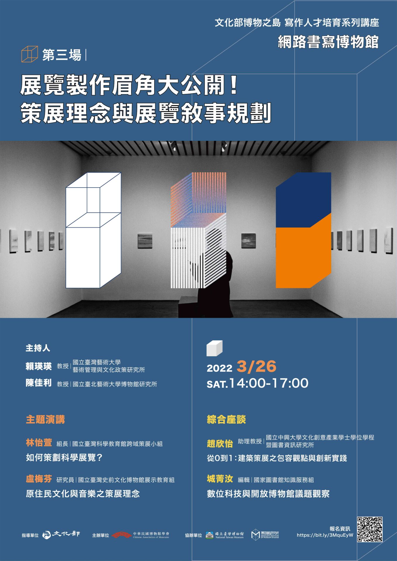 文化部博物之島網站作為博物館資訊入口網,特設立國內外資訊專區,以新訊報導和專文評論,讓關心博物館議題的你即時掌握全球動態,並特別策劃四場「網路書寫博物館—文化部博物之島寫作人才培育系列講座」。第三場的主題為「展覽製作眉角大公開!策展理念與展覽敘事規劃」, 邀請到國立臺灣科學教育館跨域策展小組組長林怡萱、國立臺灣史前文化博物館展示教育組研究員盧梅芬,以及國立中興大學文化創意產業學士學位學程暨圖書資訊研究所助理教授趙欣怡、國家圖書館知識服務組編輯城菁汝,分享他們豐富的策展思維與展覽敘事規劃。