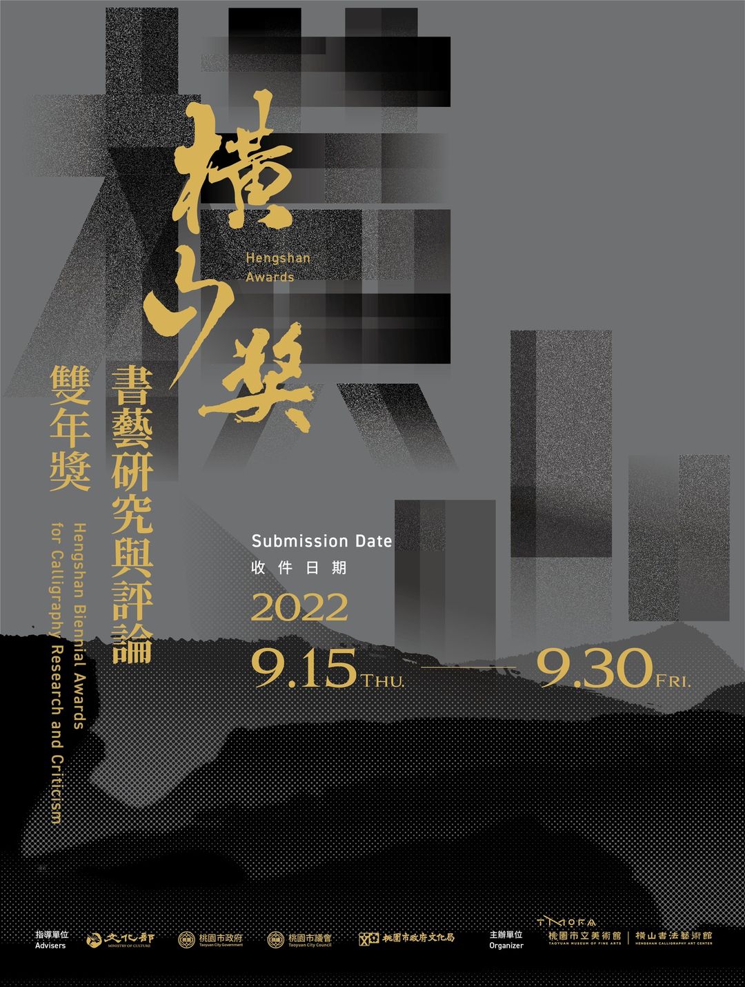 為培植和發掘書藝研究與評論人才,桃園市立美術館橫山書法藝術館徵求三年內撰寫之未曾正式發表、未曾獲獎補助之書藝研究或評論,一人可同時參加研究論文及藝術評論類之獎項。報名資格不分國籍、居住地、年齡。歡迎對書法藝術關注之民眾和研究者一起參與,共同推動書法藝術之討論風氣與研究、評論的發展。