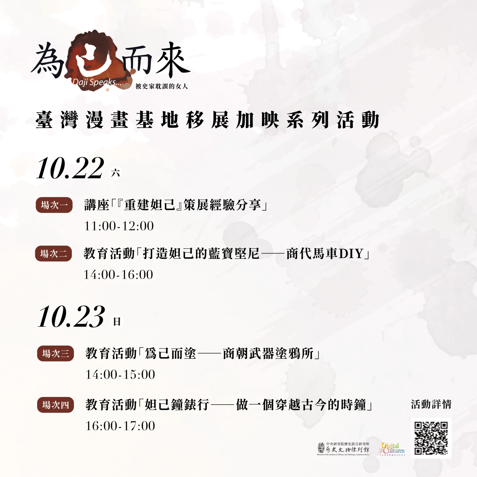 2022年10月,中央研究院歷史語言研究所歷史文物陳列館「為己而來—被史家耽誤的女人」於臺灣漫畫基地展出期間,在10月22日與23日辦理加映系列活動,有線上策展經驗分享的講座,還有親子共享的教育活動,歡迎大家來參與。