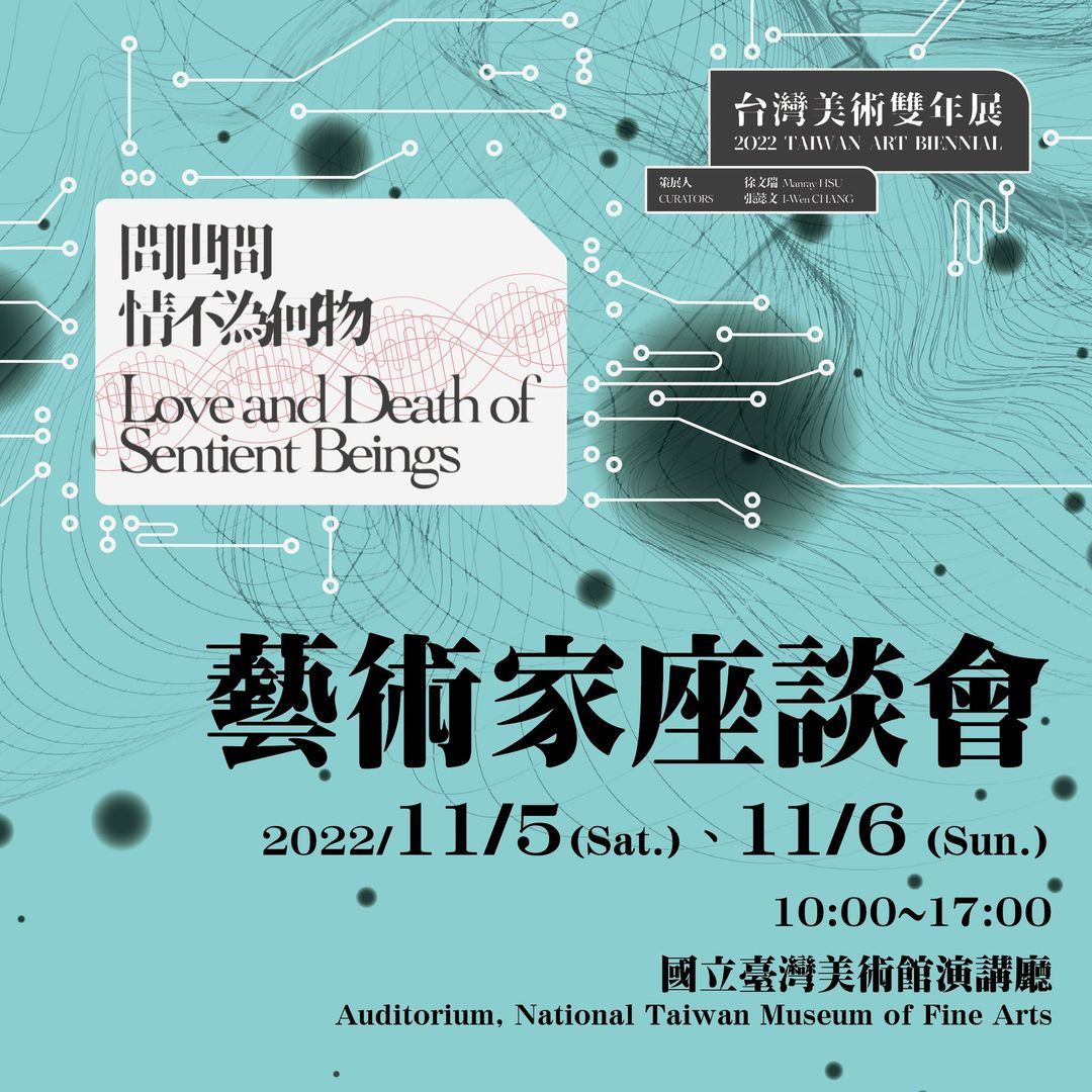 本座談將邀請「2022台灣美術雙年展」參展藝術家與會,藝術家將介紹本次參展作品以及創作理念,並與策展人和專家學者交流對談,探討如何運用創作的不同形式以及多重開放的宇宙觀點,回應萬物有情的策展概念,展現多面向的創作思維與藝術視野。