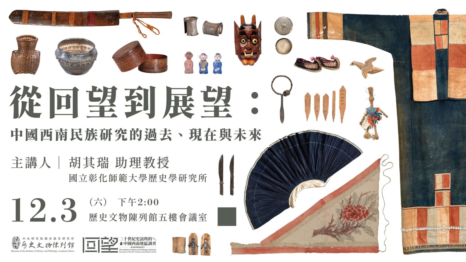1920至40年代,中央研究院社會研究所與歷史語言研究所(以下簡稱史語所)研究人員曾先後數次前往中國邊疆地區進行民族調查,並在調查中蒐集了許多的文物與文書,拍攝了許多照片及影片;這些寶貴的資料後來都進入了史語所,部分藏品也一同到了臺灣,成了這次「回望」特展的展品。主講人胡其瑞教授多年前曾服務於史語所,協助整理這批中國西南民族的資料以進行數位化與資料庫的建置,並多次前往這些藏品採集的地點進行田野調查。此次演講將介紹過往史語所在中國西南調查的點滴,並講述當代的田野歷程,以及數位時代下西南民族研究可能發展的未來。
