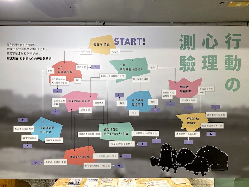 展覽結尾的一項「行動心理測驗」,提供觀眾透過數個簡易的問題,配對適合自己的非營利組織,期待觀眾在觀展結束之際能延續自身深刻的感受,以個人特質為基礎,找尋一個採取行動的起點。相較教條式的行動呼籲,或許透過富有幾分趣味的途徑,能讓觀眾擁有進一步瞭解這些組織的動力。