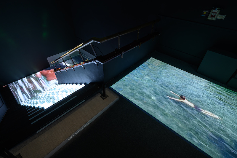 江國梁的《游水》,呼應田中央事務所所在地—宜蘭,將「水」的元素提煉出來,將對宜蘭的情感透過游泳、戲水的畫面表達出來。將錄像作品投影在樓梯、走道空間,使平面錄像產生立體空間的落差,觀眾得以實際介入錄像作品,可以自身身體或影子和作品互動。