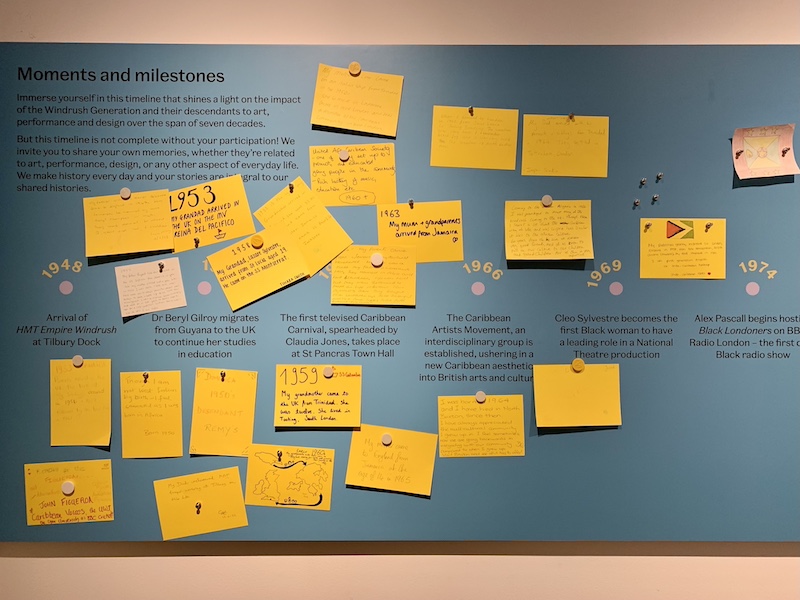 位於V&A地面樓層的學習中心,延伸「兩個世界之間」展覽,由倫敦當地加勒比青年策展、挑選疾風世代移民社群歷史上重要事件及里程碑,製作成時間軸讓觀眾更進一步了解移民歷史。此展區的特別之處,是邀請加勒比社群觀眾在時間軸上也寫下自己或家人的小故事,讓整個移民歷史更為豐富、完整,也展現家庭與社群強大且溫暖的力量。