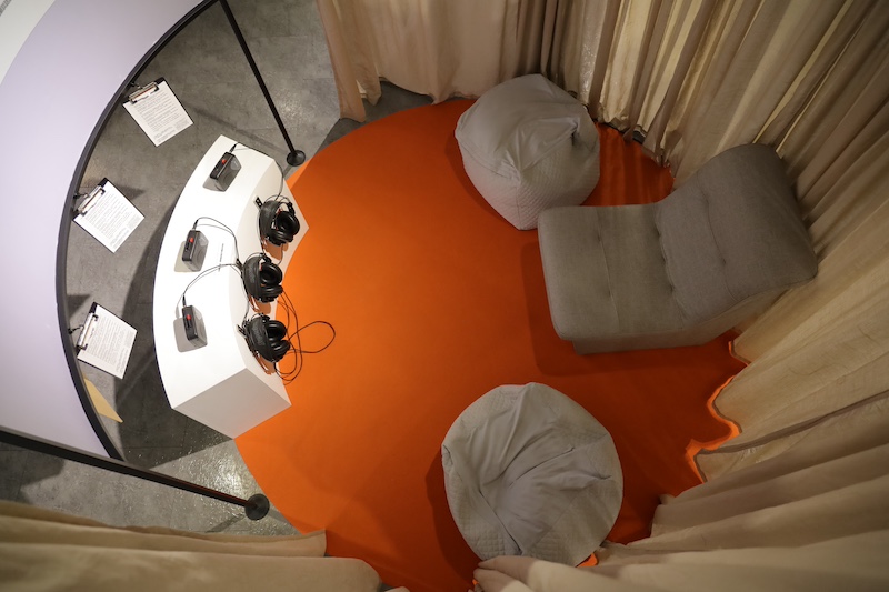 面對承受暴力的記憶,時常牽動出高度的憤怒、悲傷等強烈情緒,因此展場在視覺上以冷色、去識別化的圖像為設計,對於社運事件本身不做太多再現,讓觀眾稍微帶著距離地觀看抗爭者的敘事。而展場中央的「療遇時光機」,則以暖色布幕圍出的空間,確認自身做好聆聽創傷經驗的準備後,觀眾可以靠臥在懶骨頭沙發上,以放鬆、舒適的狀態,播放卡帶隨身聽內的音檔,長達70分鐘的音檔改編自同儕團體中的實際對話,是觀眾與抗爭者的創傷更直接的相遇。