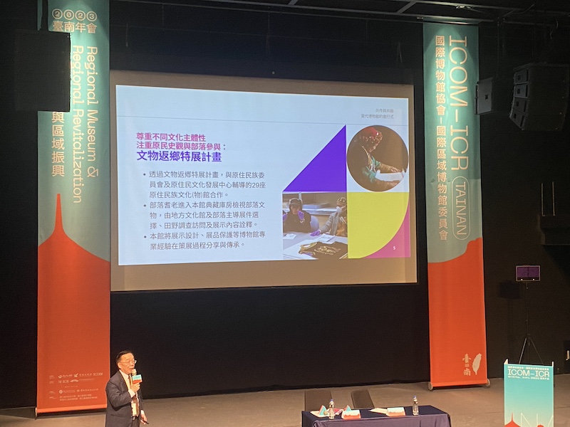中華民國博物館學會理事長洪世佑則以國立臺灣博物館「文化共作」的概念為例,說明該館持續參與原住民藏品研究、展示策劃和工藝品加值運用,文化平權之博物館處方籤,以及擴大館藏品與社會連結的推廣計畫等工作面向,談論國立博物館與地方社群的協作的方式與成果。