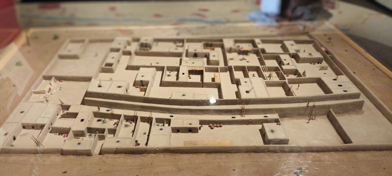 蘇烏達瓦阿基博物館文物歸還特展,紅色展示架上遺留著文物曾經停留的印記。(劉曉樺 攝影)
