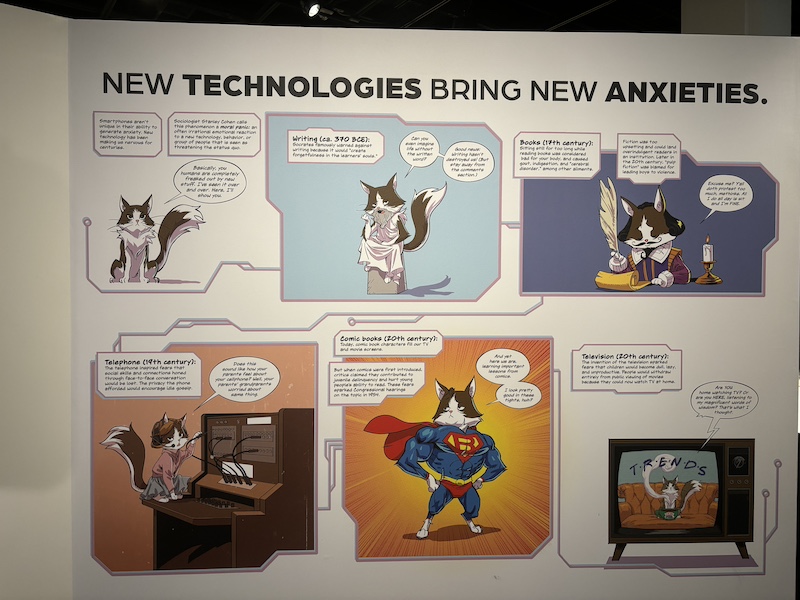 展覽也運用大量的流行圖像,藉由大眾較為熟悉的元素吸引觀眾的眼球,並以此呈現手機所引發的嚴肅議題。例如,展覽中可見幾幅大型以手機為議題的漫畫,標題為「手機對你的生活有多大影響呢?」(How much does your cellphone influence your life),漫畫內容則講述手機可能帶來的暴力或心理焦慮問題。