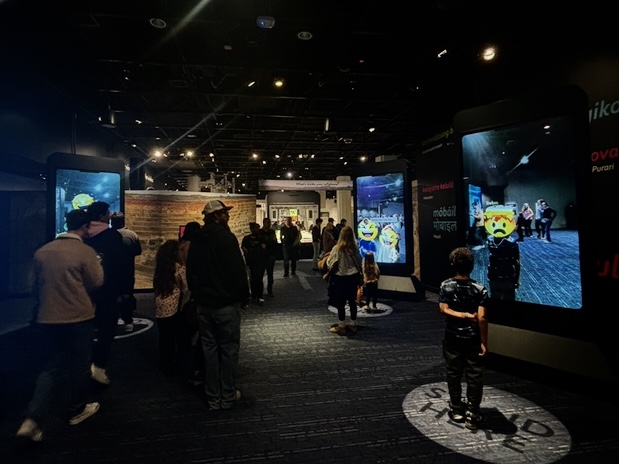 整個展覽最令人驚喜的就是充滿互動性的多媒體展示設計,例如,在展覽入口可見以手機作為外型設計的大型螢幕,觀眾可以在這些巨型手機螢幕前看到自己的臉變成可愛的Emoji表情圖案。