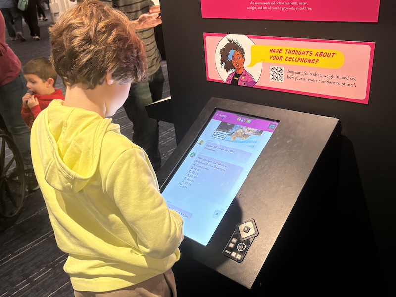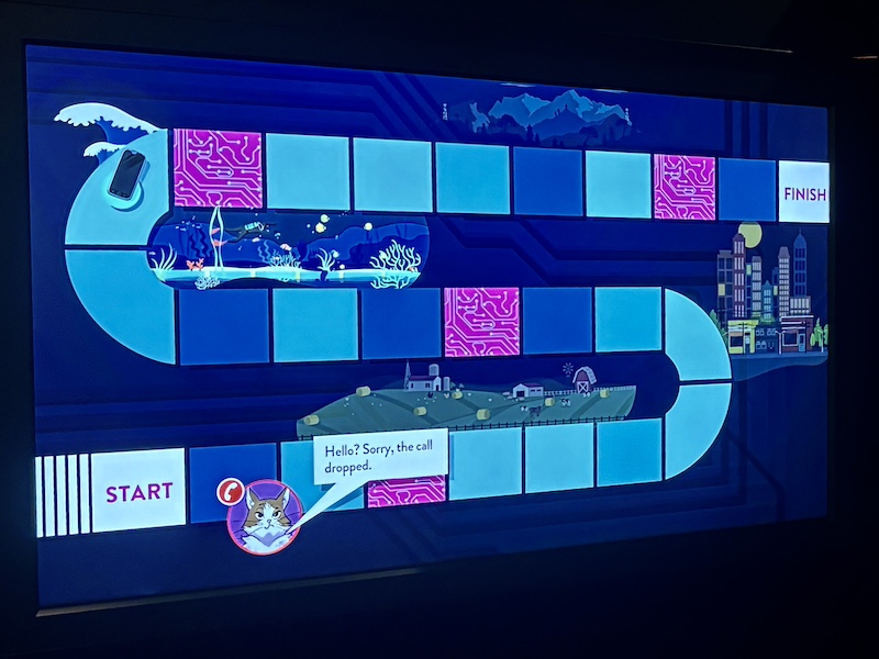 另一方面,展覽也扣合不同展區主題設計多媒體互動遊戲,例如,透過遊戲讓觀眾化身成手機修復師,體驗修復手機的過程;或是以手機為主題的大富翁遊戲。觀眾留言板也設計成宛如同通訊軟體的介面,使觀眾透過問題思索手機使用的方式與經驗,也能夠藉由QR code看到其他觀眾的想法。