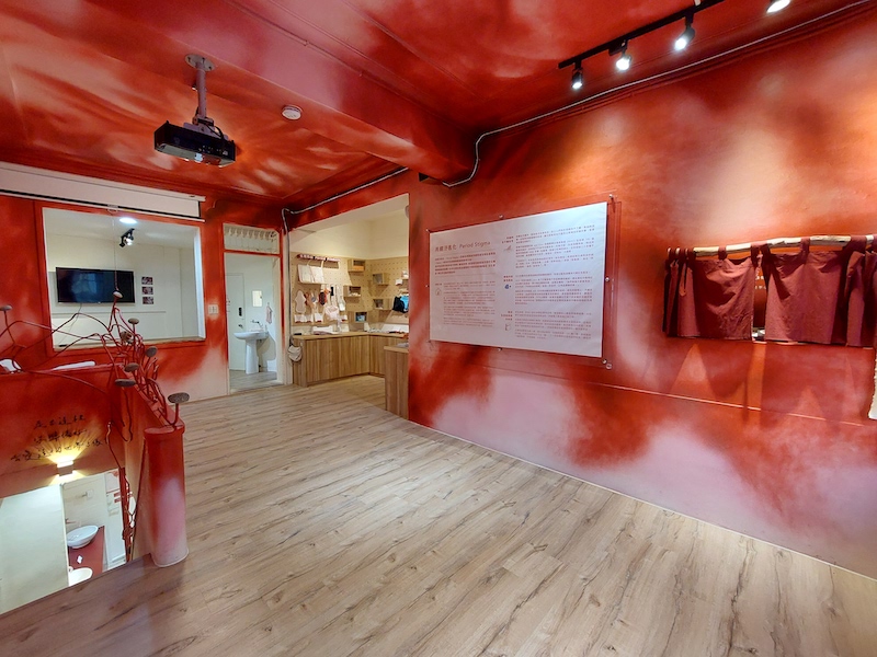 全球首間月經博物館在2022年6月30日正式開幕,座落臺北市大同區。2樓展場以帶著暈染效果的紅色背景,搭配月經相關問題、生理現象與心情,引導觀眾進入月經的世界。(張慈安 攝影)