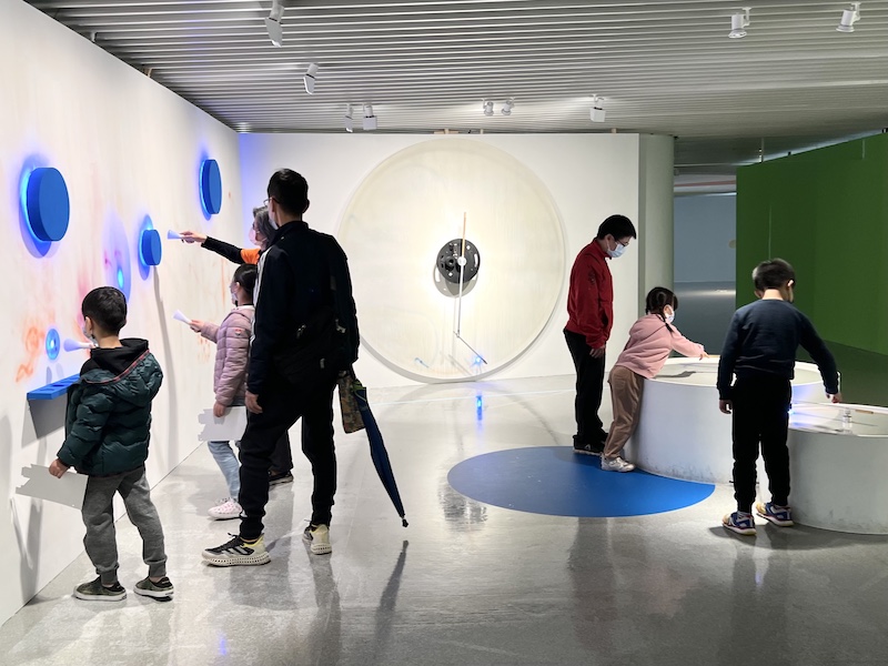 不同於嚴肅寧靜的白盒子空間,兒美館充滿歡聲笑語,以及穿梭於各件作品中的身影。在作品《非線性科學:混沌》前,兒童開心地拿著手電筒在展牆上畫畫,藝術家蔡宜婷將展場打造為大型「光畫布」,透過感光原理記錄光的軌跡,兒童也可使用如畫筆般的紫外燈光源,一同在展場中以「光」創作。
