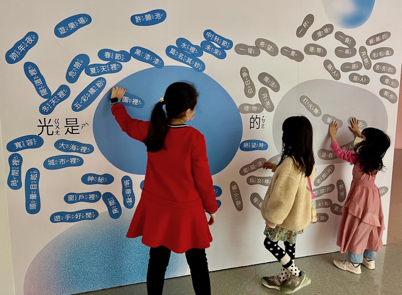 展牆上的作品解說亦跳脫直述型的知識傳遞,藉由提問、邀請、鼓勵等口吻,引導兒童與作品互動,激發對藝術的好奇與思考。展覽尾聲特別設計「拼字遊戲」,兒童可選擇不同的詞語詮釋光的定義與形象,反思光與自身的連結。