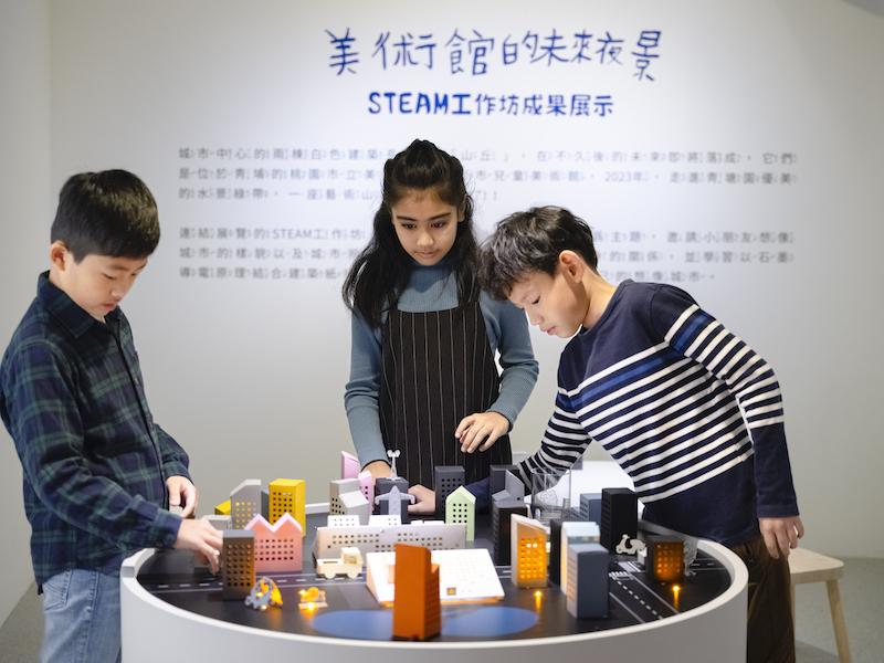 為了打造更多元的藝術展演與教育空間,未來兒美館將遷至位於桃園青埔的新建館舍,特展也連結此發展,與自造教育團體合作規劃STEAM工作坊,讓兒童化身城市建築團隊,想像城市有著什麼樣貌?建築如何安排於城市空間?當中的「光」會以何種姿態呈現?