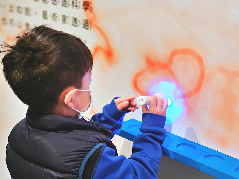 不同於嚴肅寧靜的白盒子空間,兒美館充滿歡聲笑語,以及穿梭於各件作品中的身影。在作品《非線性科學:混沌》前,兒童開心地拿著手電筒在展牆上畫畫,藝術家蔡宜婷將展場打造為大型「光畫布」,透過感光原理記錄光的軌跡,兒童也可使用如畫筆般的紫外燈光源,一同在展場中以「光」創作。