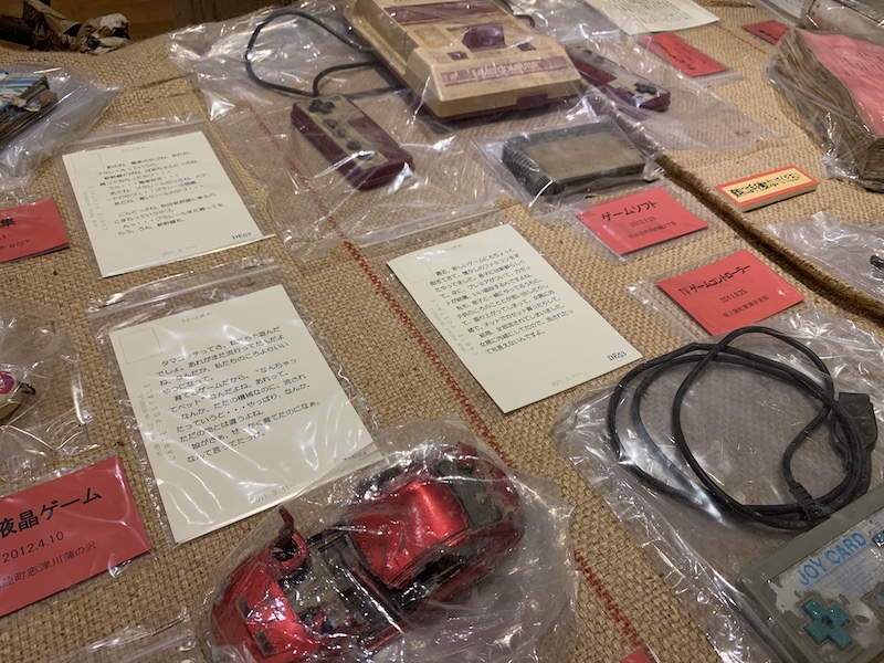 受災物件部分,則精選155件學藝員在受災區蒐集的物品,進行展示。相較於保存與陳列物件,館方更在乎如何呈現物件乘載的無形記憶,並促進記憶傳承與對話討論的機會。因此在展示型態上,物件旁皆擺放了明信片樣式的文字卡,以第一人稱口吻敘述與物件有關的種種故事。文字內容跳脫常見的受災者證詞紀錄方式,可見在地方言的使用,靈動保留了當事者的說話語調。如此細節的設計,讓觀眾有如閱覽一封封來自受災者的信件,得以感同身受其中蘊含的強烈情感,以及那些曾經的日常生活樣貌。