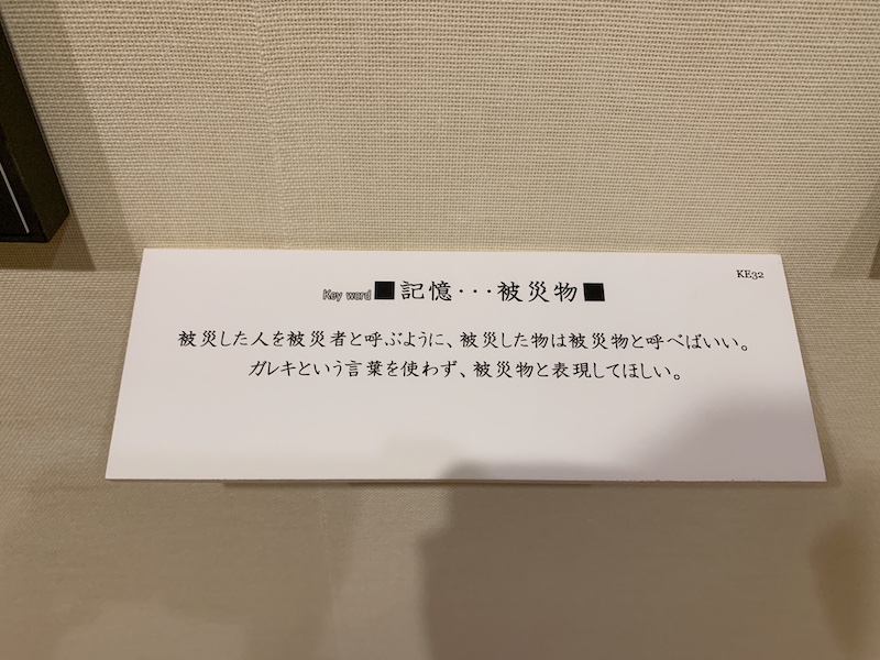 除了受災區的第一手影像和物件資料,館方也彙整了東日本大震災相關新聞報導與研究內容中常見的關鍵字,從中探討用詞意義的微妙之處,並於影像展品與展品之間以字卡穿插展示。例如展覽中提到以「瓦礫(ガレキ)」與「受災物(被災物)」來指稱災區物件的意義差異,在於「瓦礫」用以泛指沒有價值、無用的磚瓦殘骸等;而「受災物」則突顯了物件與災害的關連性,以及記憶的乘載。因此相較於「瓦礫」,以「受災物」指稱災區物件時,得以更適切的表達物件不只作為物件的豐富意義。