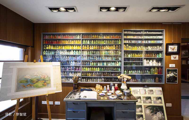 紀念館有三個常態展、兩間和室展廳,根據展覽官網介紹,大部分的空間格局和家具配置都保留了林之助的設計。走進入口右手邊的常設展廳,精美豐富的膠彩顏料壁櫃迎面而來,十分吸睛,儼然自成一幅膠彩畫風,淺顯易懂的說明牌也讓觀眾能更瞭解膠彩原理。