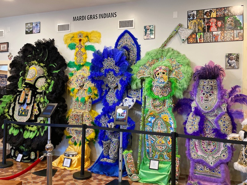 後街文化博物館的典藏與展示中,以非裔族群的狂歡節遊行文化為一大焦點。相對於主要大道(main street)上的花車遊街,在「後街」(backstreet,即工人為主的非裔美國人社區),非裔族群習慣自行製作靈感源於美洲原住民傳統服飾的全套盛裝,化身為「狂歡節印第安」(Mardi Gras Indians)。這番文化景觀最早出現於十九世紀末,在吉姆.克勞法(Jim Crow)種族隔離政策實行約十年後,一些自稱為「部落」(tribes)或「幫派」(gangs)的非裔小團體,在「大頭目」(big chief)領導下,每年製作飾以大量羽毛、珠子的遊行裝束,於狂歡節日(Mardi Gras Day)和聖約瑟節傍晚(St. Joseph’s Night)著裝遊行。