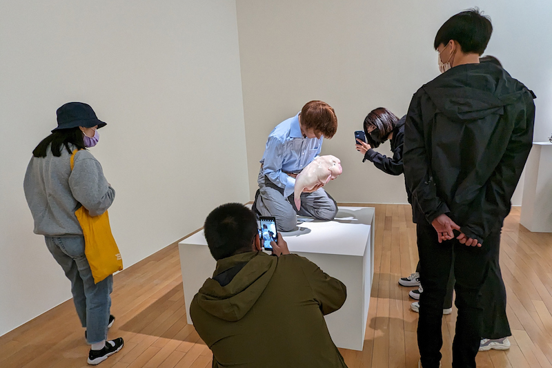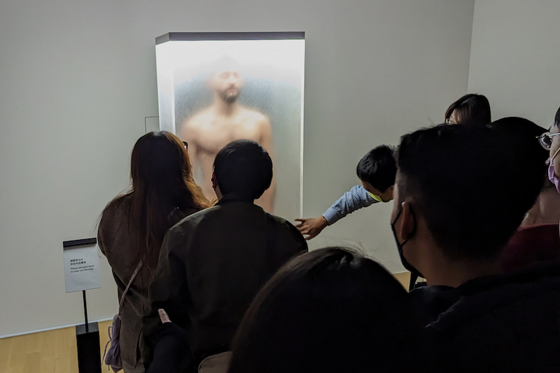 特展亦有多件結合科技應用的展品,鼓勵觀眾一起動手、參與藝術的意義建構,體驗不同維度的雕塑觀點。第三展區「藝術家4.0」的部分項目,便採用投影和擴增實境(AR)技術,使虛擬建模角色活躍於展場空間中。Santissimi裝置作品〈體內(M1)〉,更明文指示觀眾可以動手沾水塗抹霧化玻璃,從意圖窺見箱內裸身蠟像的行為,與其建立既親近又陌生的微妙連結。此外,展場中另藏有兩件Peter Land的〈時間〉,這些逼真的「人造蘋果」雕塑靜靜等待觀眾不經意地發現,為整體展覽增添令人會心一笑的亮點。