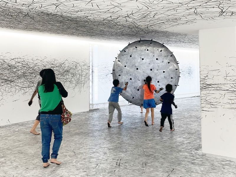 在一樓藝術街坊區域,由數十位跨域創作者以「做圓 Making Circle」為主題推動藝術實驗。其中,德國藝術家Karina Smigla-Bobinski的作品〈ADA〉,鼓勵觀眾進入純白空間,與裝設300枝炭筆的巨大透明塑膠球互動。筆者觀察,有許多親子投入其中,當空間中圖案越趨繁複,參與者也正與藝術家共同創作。