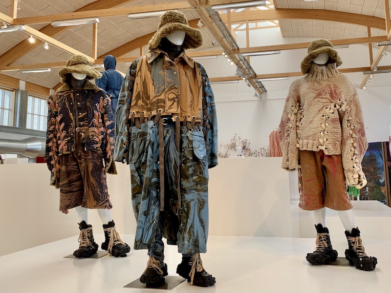 中央展區的「無人花園(No Man’s Garden)」系列男裝,是芬蘭新銳設計師Elina Heilanen的作品。她以滯銷布料和手工植物染技術製造大理石紋,建構出堆疊布料、過大尺寸與束繩編織為基底的時裝。此系列的束繩設計巧思使衣物能不斷被調整,大面積的布塊則容易修改剪裁,以符合不同身型的使用者,種種設計均讓衣物的生命更貼近永續使用。