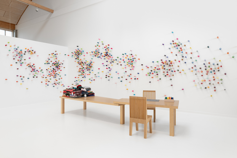 展場後方的繽紛線軸牆面,更是十分吸睛。棉線溫和的線條綿延、連接至長桌上的個人日常衣物,臺灣藝術家李明維的「補裳計畫」邀請觀眾攜帶一件需要修補的衣物至展場,親自交給長桌對面的志工「補裳人」,修補破損過程中,開啟觀眾與補裳人的對話交流與經驗分享,觀眾從而成為「補裳計畫」的一部份,體會在縫與補之間串連起的情感。