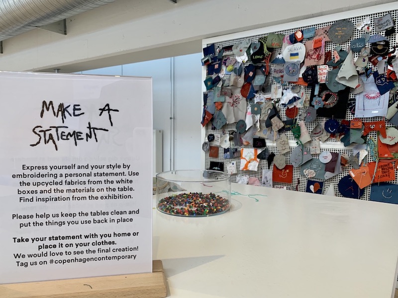 最後,展覽設置手作區,邀請觀眾利用館方提供的碎布與材料,以簡單的工具創作自己的作品,表達個人的聲音和創意。一針一線之間,有些觀眾俐落手持針線一邊閒話家常、有些人在熟悉針線過程中,互相分享創作,一旁志工更主動而友善的與觀眾討論展覽想法。本次特展集結許多能讓觀眾參與的作品,不僅加長觀展時間,也讓觀眾印象深刻,透過衣物與針線縫補,探究更大層面的環保,包含人與人、人與物質以及人與地球資源之間的關係,面對地球危機,時尚設計應扮演兼具環保與創意的推手,共同為永續經營努力。