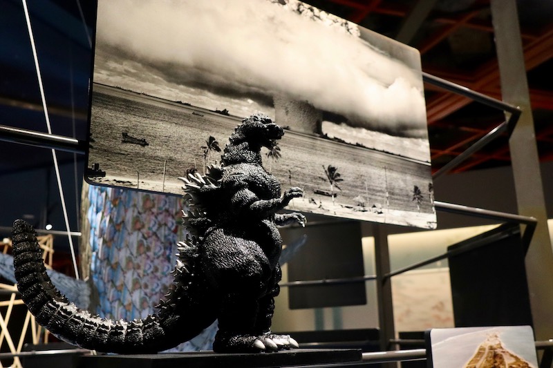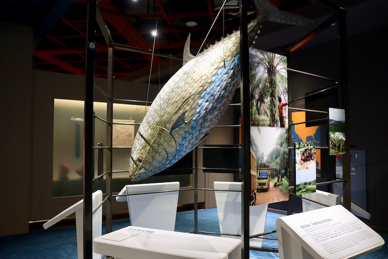 Through the artwork “Sashimi" by Amis artist Chih-Ming, Fan, which is made from tuna cans, the exhibition conveys the issues of depleted marine resources and the drastic changes experienced by indigenous communities due to global capitalism and industrial development. It also highlights the haze and ecological imbalance caused by the palm oil industry in Southeast Asia, shedding light on the extensive environmental damage caused by multinational corporate products. The exhibition brings attention to the dark side of global development, including the Pacific garbage patch. The exhibition also addresses the looming crises of extreme climate events and rising sea levels. By showcasing a Godzilla monster model representing radioactive pollution, the exhibition reveals the suffering imposed on Austronesian communities, such as the nuclear waste storage in Orchid Island and nuclear testing conducted by Western countries in Pacific islands. This emphasizes the urgent need for discussions and changes regarding climate and environmental justice.