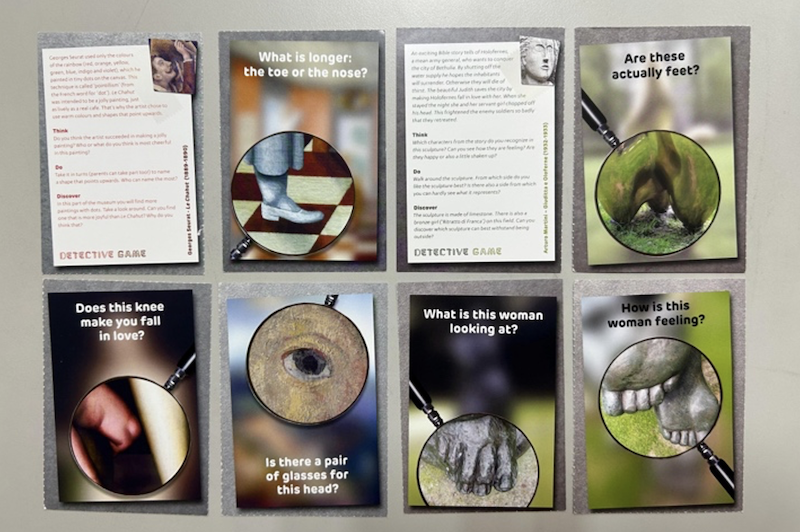 有別於骰子遊戲提供完全開放性的探索體驗,博物館另設計數款主題偵探遊戲,引導觀眾認識博物館的特定典藏,例如提供給4歲以上親子觀眾的:「頭、肩膀、膝蓋和腳趾」(Head, shoulders, knees and toes at the Kröller-Müller Museum)、「一起行腳考察雕塑公園」(Come along on an expedition on foot through the sculpture garden),以及為16歲以上年輕觀眾所規劃的「愛在藝術裡」(Love is in the art)等【註2】。每款偵探遊戲皆以卡牌形式呈現,觀眾需從卡牌上的文物局部找到四件指定文物,在內容撰寫上,親子版卡牌以思考(多角度的提問促進連結與想像)、行動(觀察細節並與同伴分享)、發現(尋找其他博物館類似作品)等路徑引導兒童觀眾探索文物,青年版卡牌則除了提供作品故事外,更強調年輕觀眾連結文物進行深度的反思、分享與對話。