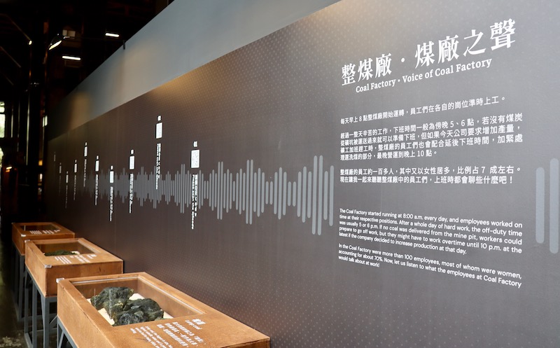 來到「煤廠之聲」展區,掃描QR code能聆聽復刻版本的台語女性礦工對談,內容包含選煤工作情況、算工資的方式,以及下工後為數不多的家庭娛樂,例如看電影。在礦工文史中,女性礦工的聲音較為稀少,尤其1964年蔣宋美齡女士視察礦區後,政府便全面禁止女礦工入坑,以避免家庭經濟支柱均從事高風險的礦坑工作。許多被資遣的女礦工轉而投身整煤廠,佔工作人力7成之多,但其薪資卻只有男性礦工的一半,女礦工在經濟的弱勢地位,也反應在礦坑之聲的聽覺體驗中。