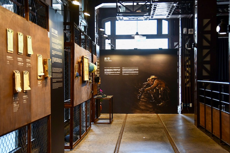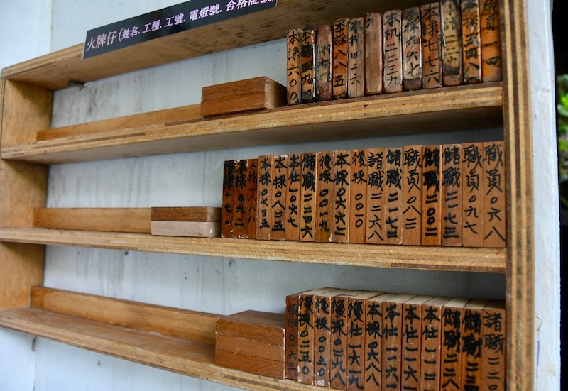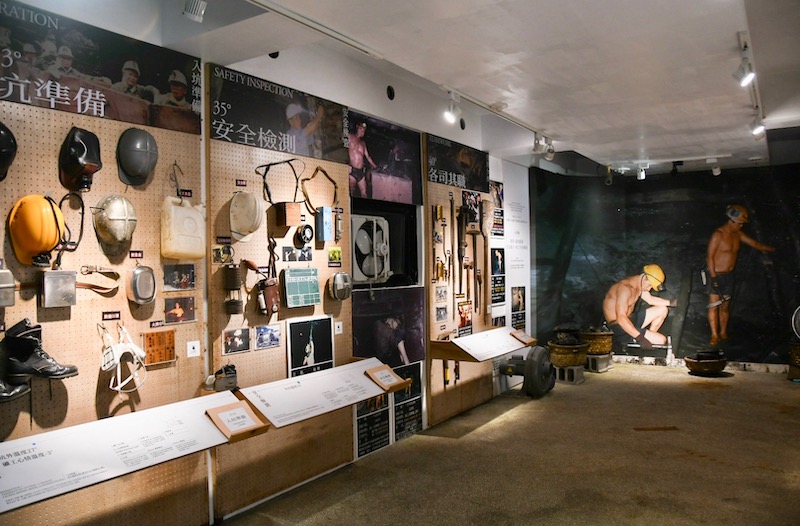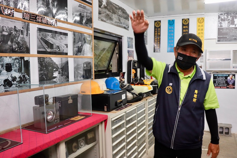 走入文史館一樓,可見2020年《近礦——風・光・坑道記憶》的展示內容,斗大標語「坑內工作要留神,為己為礦為家人」直接道出礦工工作的高危險性,後方陳列了礦工一日工作所需的用具,分為「入坑準備」、「安全檢測」、「各司其職」與「掘進爆破」等類型工具,一項項工具整齊地掛在展牆上,伴隨礦工伯伯毛振飛和周朝南一一補充,觀眾能理解每項物品的功用。如用木頭製成的「火牌仔」,是礦工入坑個人工作證,他們需與辦事處交換火牌仔,領取帽燈與電池等工具,「人在牌子就在」可謂人在坑內的證明;而「CO自救救命器」是礦工帶入坑內的救命用具,當坑內發生爆炸、產生大量一氧化碳,工人可以戴上自救器,避免吸入過多有毒氣體,同時須在時間內逃離礦坑,方能避免中毒。